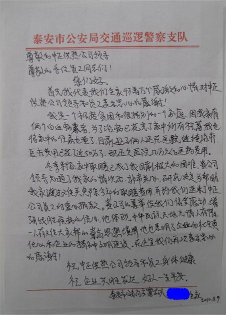 泰安市交警支隊一位家有兩個重病患者的職工深處困境,我公司得知其情況后,免除了該職工家今年冬季的采暖費,并在全公司進行一次獻(xiàn)愛心捐款活動。